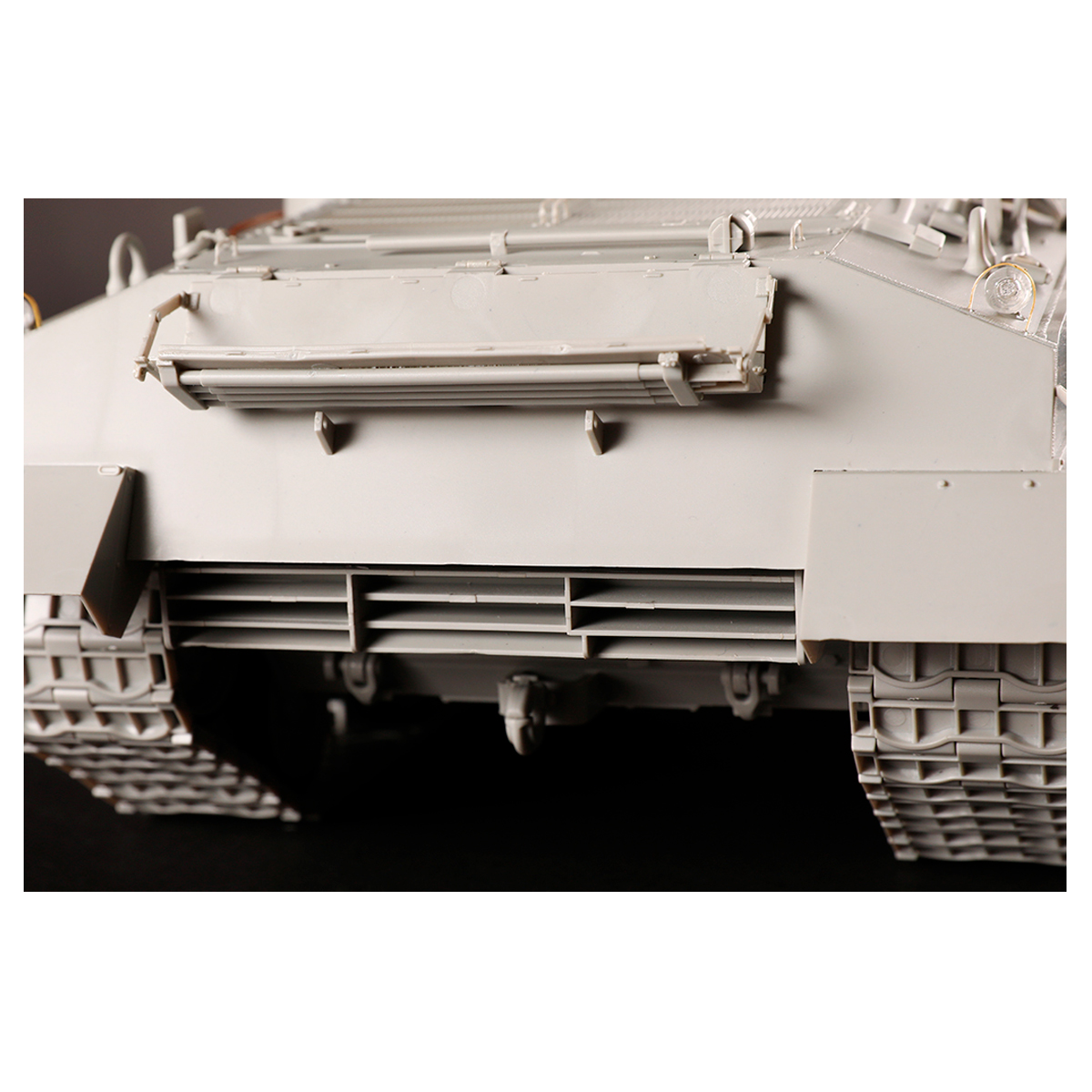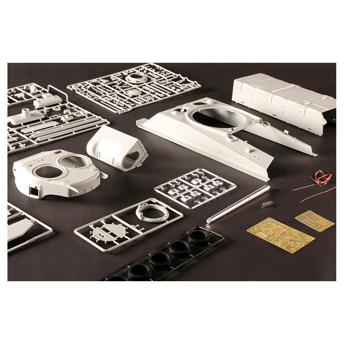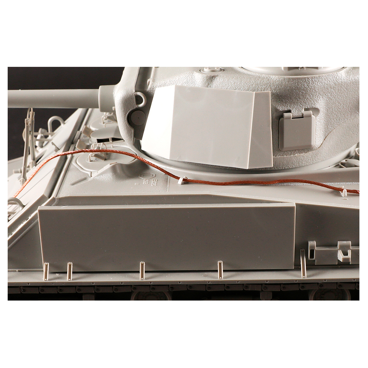 During the Korean conflict, the M 4A 3 medium tanks took part were mainly the E8 version with HVSS (horizontal volute spring suspension) system. Some were colorfully marked and had tiger faces in various forms painted on the vehicle’s front. These late M 4A 3E8 had some differences when compare to the WW2 version. A field telephone was added to the right side of the rear plate and a first aid kit box on the hull’s left. At this stage most of the M4s had added a weather tarp on the gun mantlet. Since the hinges of the heavy grilled engine access doors were too easy to get damage, a new and heavy duty hinges were introduced to M 4A 3s and this also appeared on some Korean conflict version M 4A 3E8. The kit contains all these features of the Korean conflict M 4A 3E8. Both kinds of E8 version engine decks are supplied.