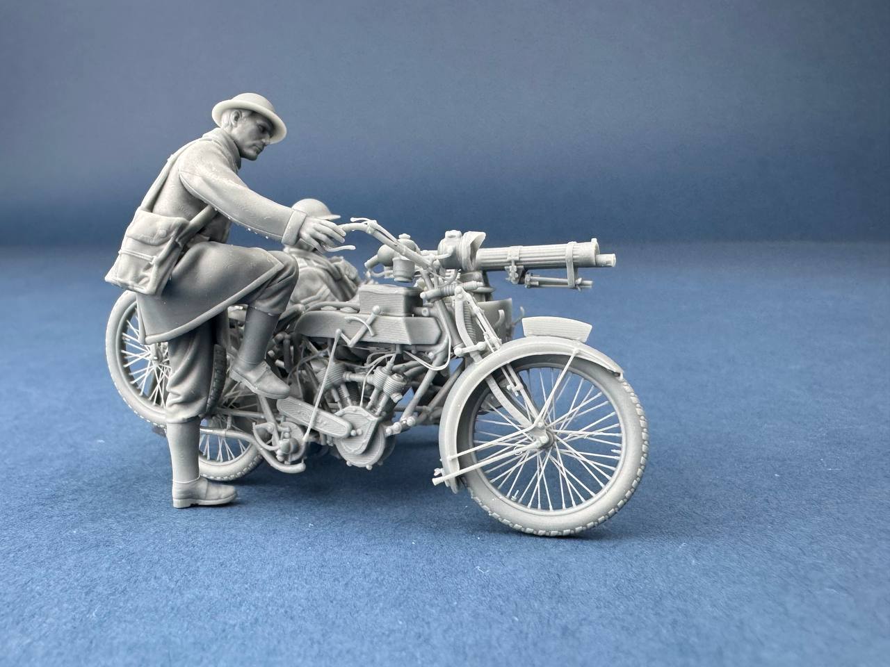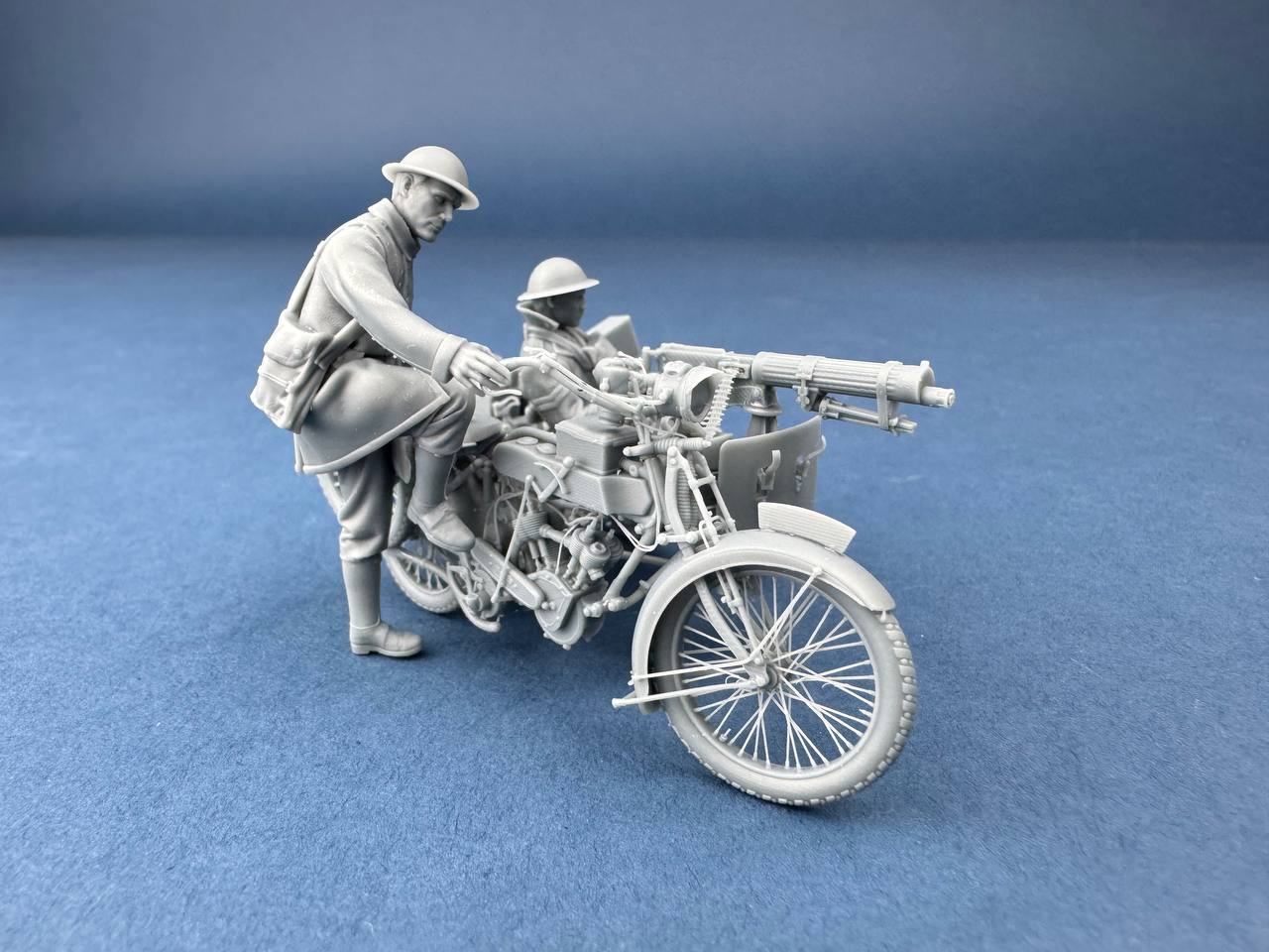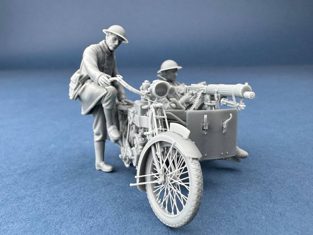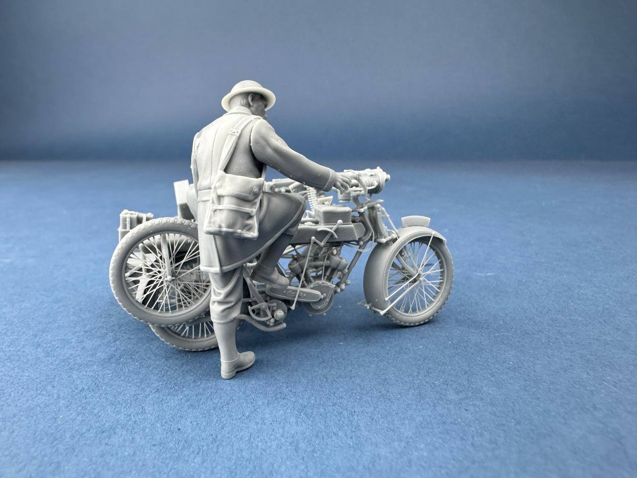 Figura impresa en 3D de un motociclista británico del Machine Gun Corps, diseñada a escala 1/35. Representado mientras arranca la motocicleta Vickers-Clyno con una ametralladora montada. El complemento perfecto para dioramas y escenas con vehículos británicos en el frente occidental.