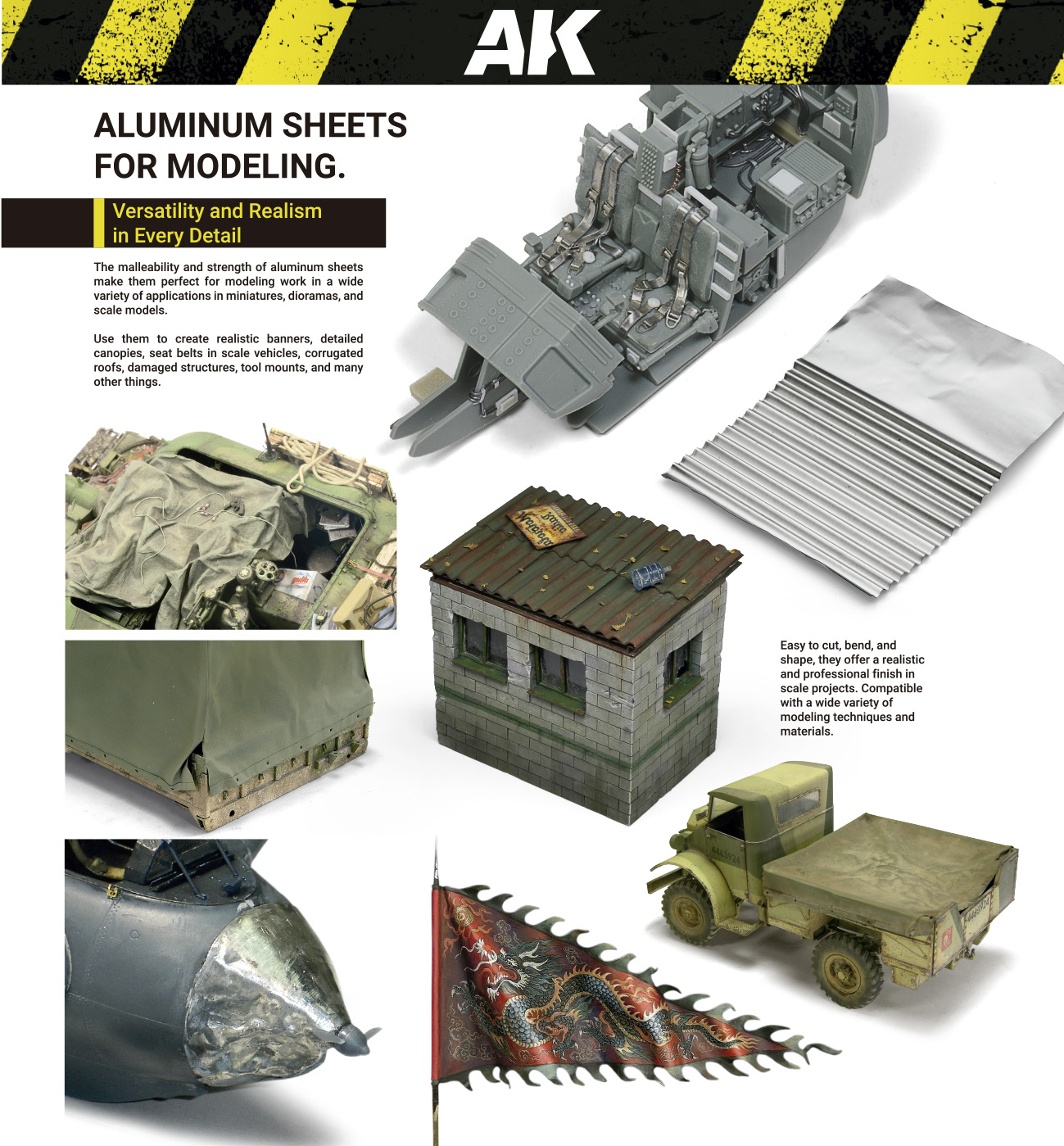 The malleability and strength of aluminum make it a perfect material for modeling work in a wide variety of applications: miniatures, dioramas, and scale models. It can be used to creat realistic flags, detailed awnings, seat belts in scale vehicles, corrugated roofs, damaged structures, tool racks, and many other elements. Easy to cut, bend, and shape, it offers a realistic and professional finish to any scale project, as well as being compatible with a wide range of modeling techniques and materials.