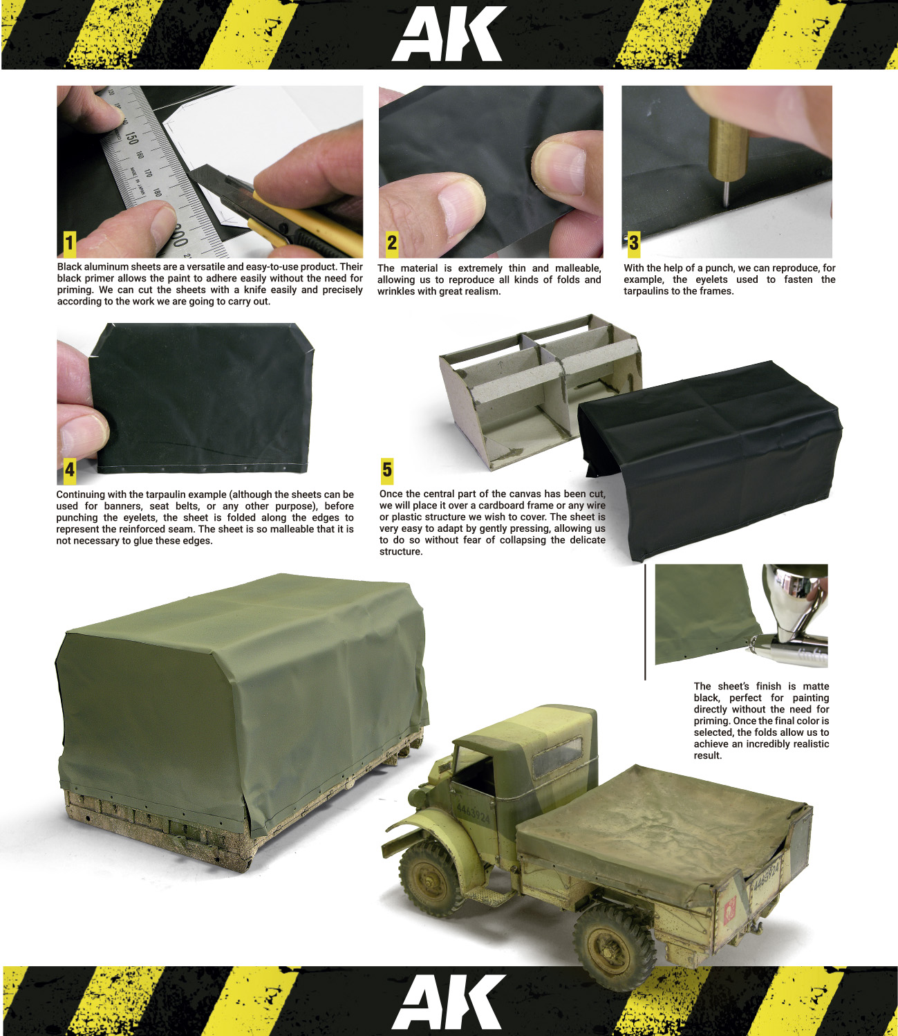 Black aluminum sheets are a versatile and easy-to-use product. Their black primer allows paint to adhere directly, with no need for prior priming. They can be easily and precisely cut with a craft knife, adapting to the task at hand. The malleability and strength of aluminum make them ideal for modeling work in a wide variety of applications: miniatures, dioramas, and scale models. In addition, they are compatible with numerous modeling techniques and materials, offering realism and versatility in every detail.