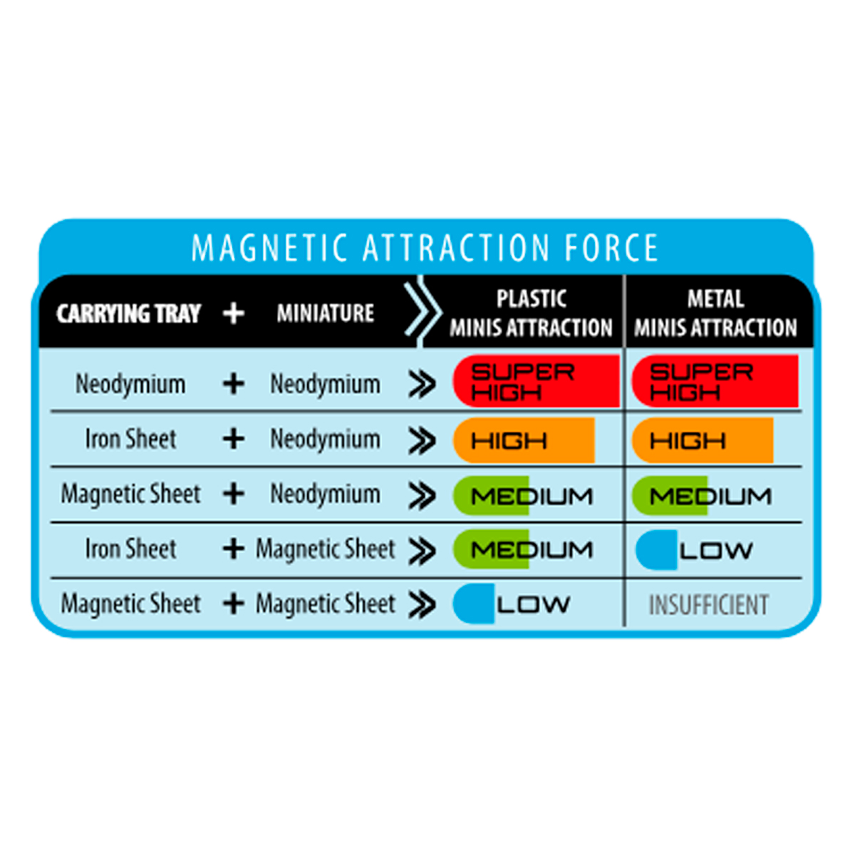 Please note that the force of attraction is determined by the weight of the figure (plastic or metal) and the type of magnet or magnetic plate used (see table).