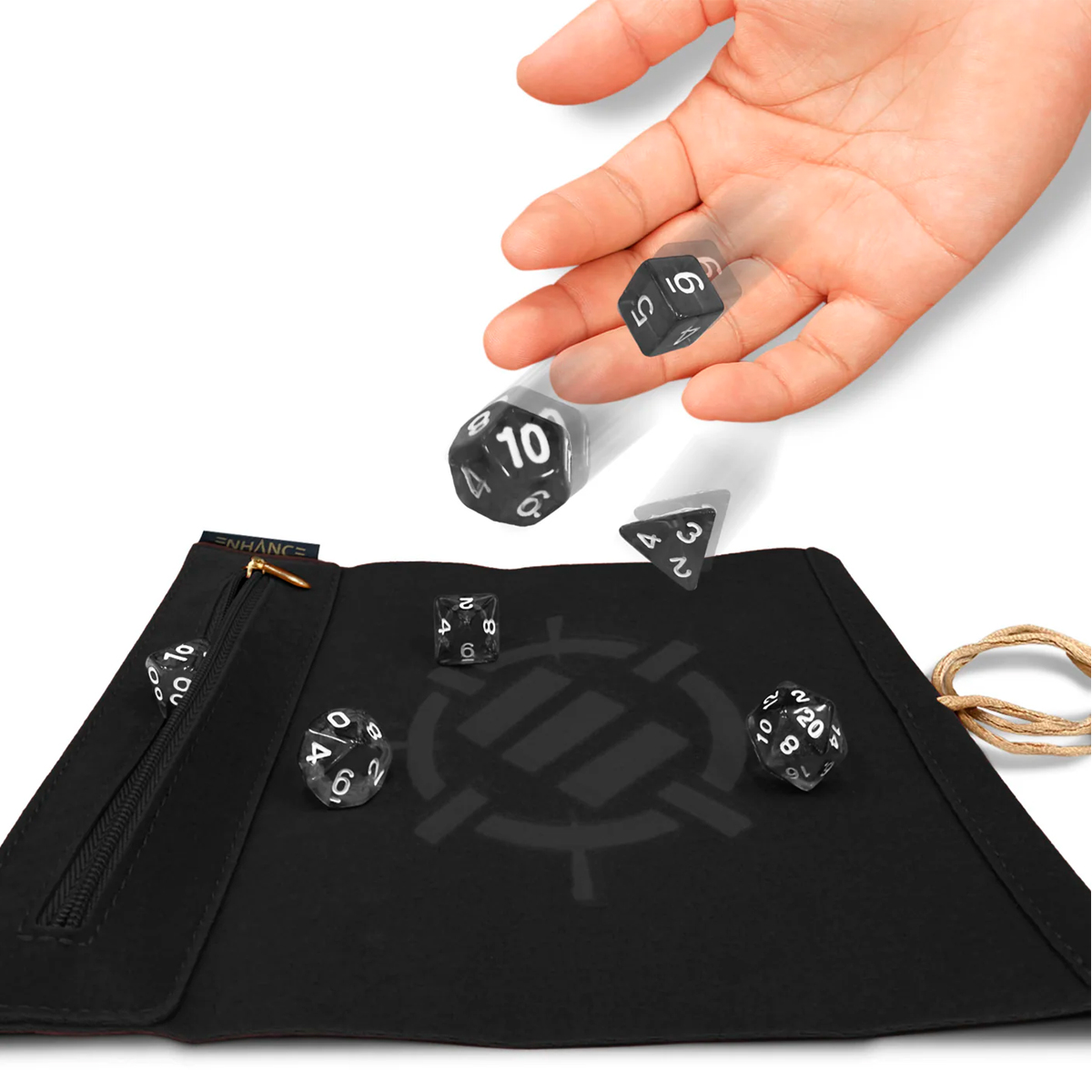 ENHANCE Roll on a Scroll™ Alfombrilla para tirar dados y juego de 7 dados acrílicos (negro)