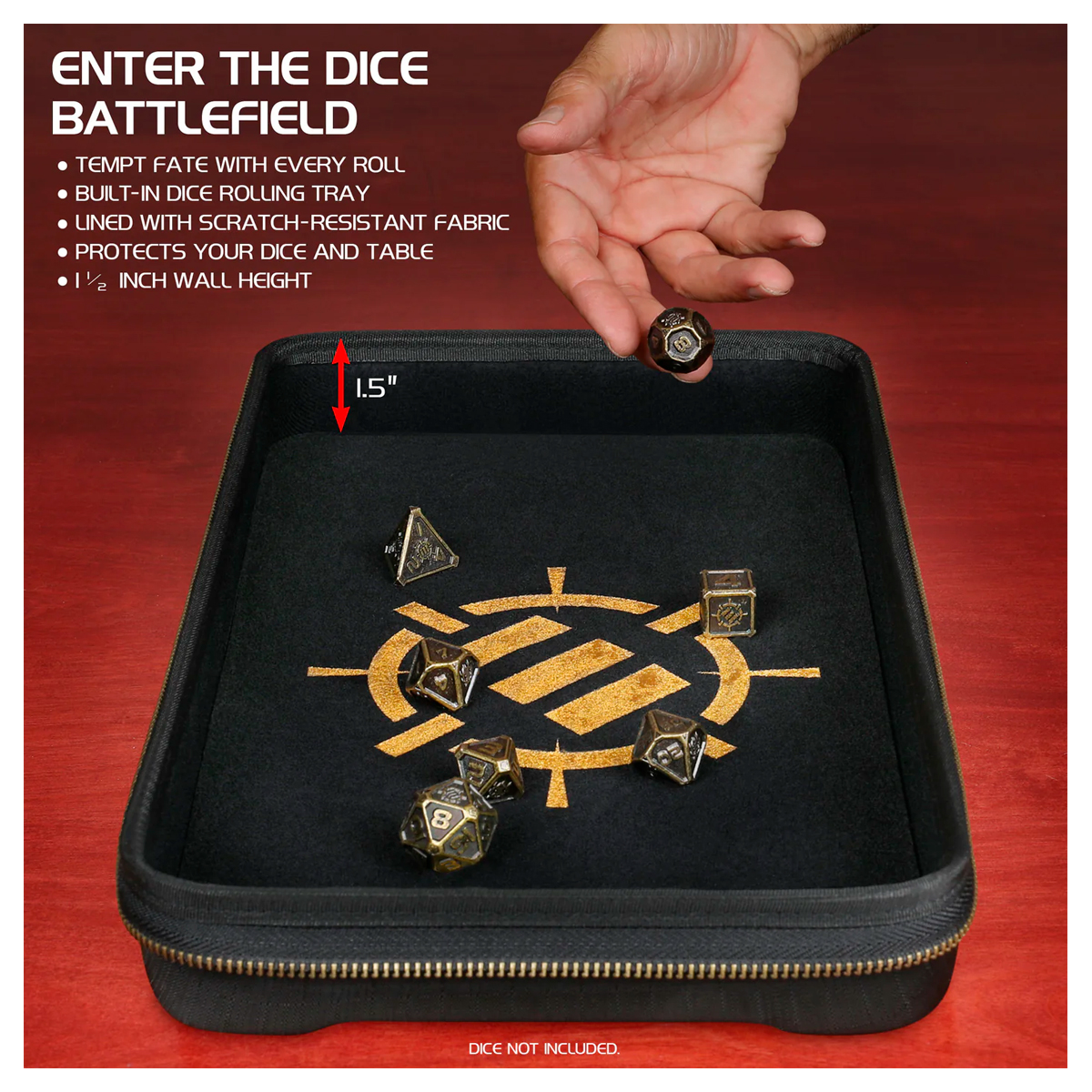 ENTRA EN EL CAMPO DE BATALLA DE LOS DADOS: Una gran bandeja para tirar los dados con un forro suave y paredes altas que evitan que los dados se salgan; lo suficientemente grande como para que todos los que estén alrededor de la mesa puedan tirar los dados.