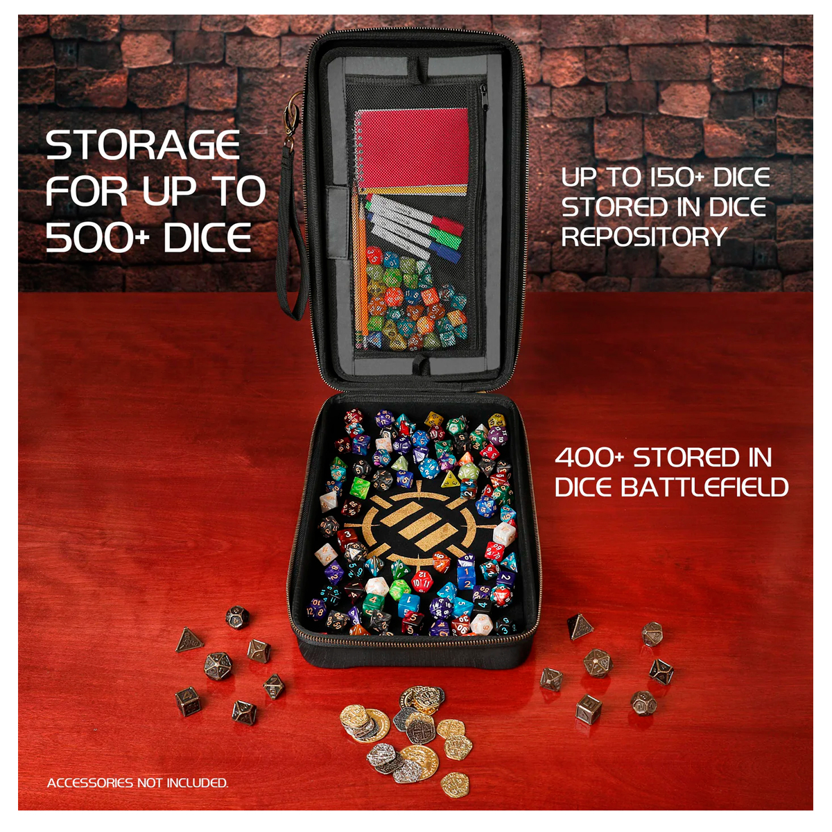 DISEÑO 3 EN 1: Guarda, organiza y enrolla tus dados con un diseño resistente con cremallera que puede contener más de 500 dados; mantén ambos lados del estuche juntos para guardarlos o sepáralos fácilmente durante el juego.