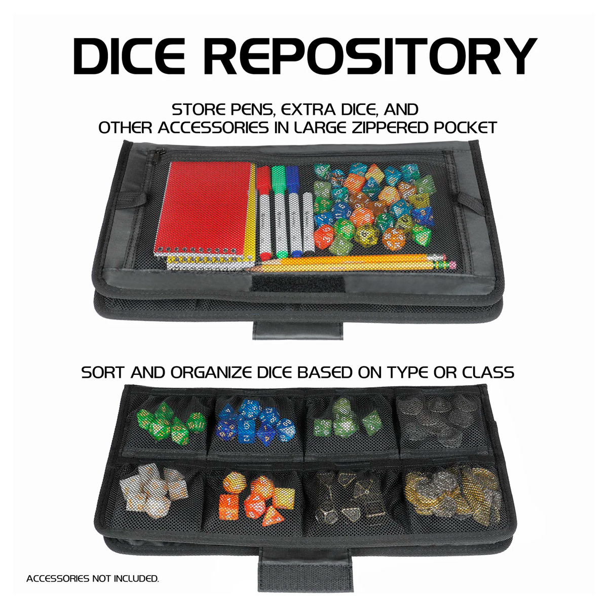 DICE REPOSITORY: Detachable dice organizer with 8 small pockets and a large zippered pocket to sort up to 150+ dice based on type; hold other accessories such as tokens, pencils, and notepads too