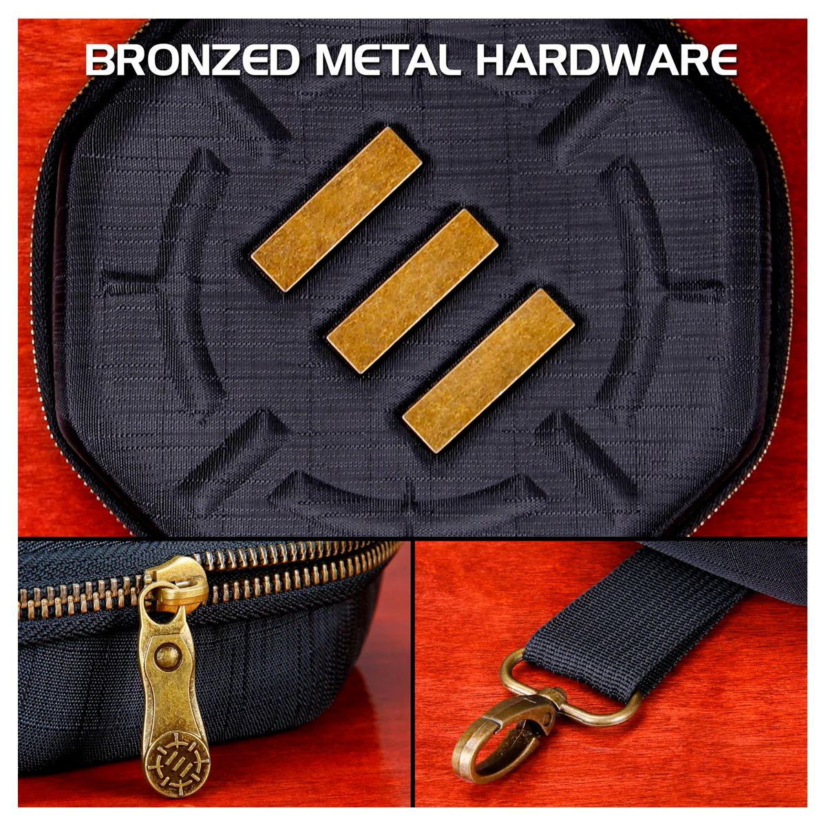 HEAVY-DUTY ANCIENT BRONZE: Worn finished metal hardware is stylish and feels in theme with all your fantasy RPG games. Arrive to your next game in style with this dice tray and dice case combo