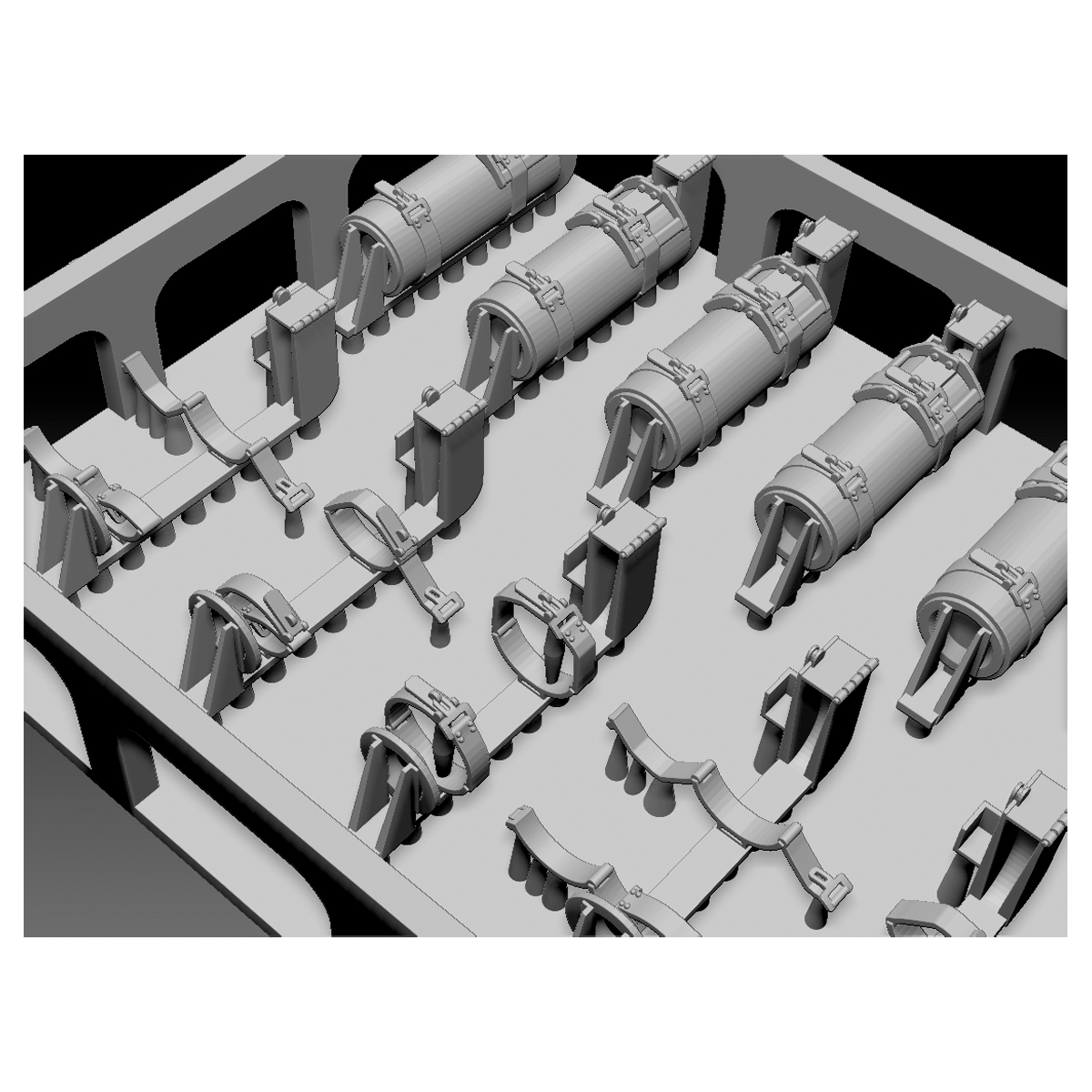 Se trata de un conjunto detallado de piezas impresas en 3D con precisión para reproducir los extintores montados en diversos vehículos, como tanques y carros blindados, utilizados por el ejército alemán durante la Segunda Guerra Mundial.