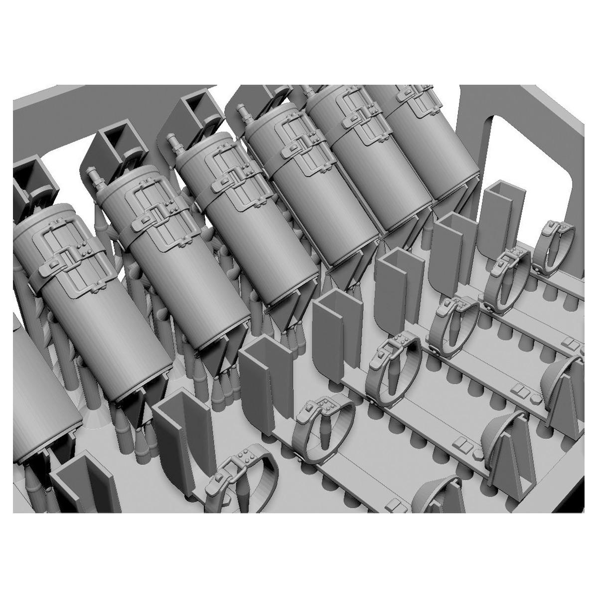 It reproduces the later model, seen towards the end of the war, with a simplified bracket with a single clamp to secure the fire extinguisher. The set includes seven fire extinguishers attached to the bracket and seven brackets alone, recreating two different clamp positions.