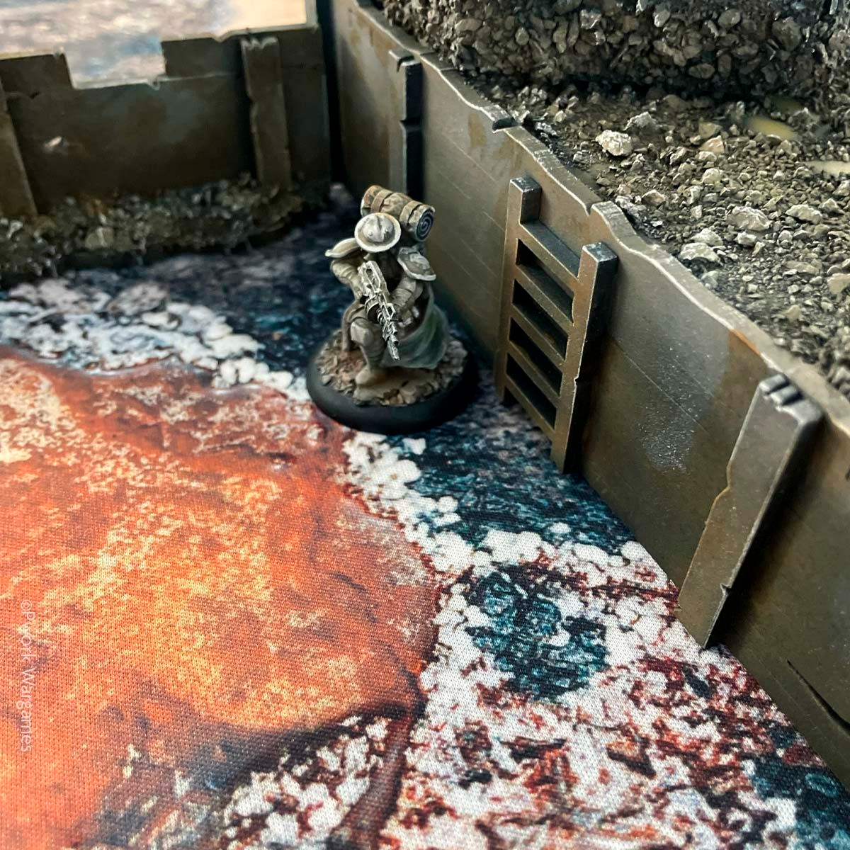 Adéntrate en las trincheras con Trench Warfare, el tapete de juego de guerra ideal para recrear escenarios bélicos detallados, perfecto para cualquier tipo de batalla, lleno del horror y la desesperación de un conflicto sin fin. Perfectamente compatible con Trench Crusade.
