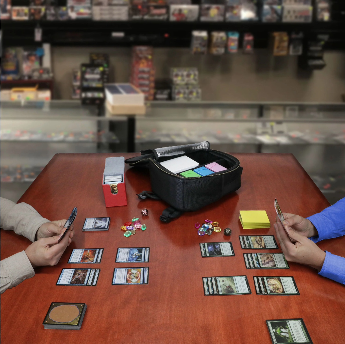 Bring your best to your next tournament or game night! The ENHANCE Magic the Gathering Backpack that features a spacious interior designed to store up to 2 400-Count cardboard boxes for cards, deck boxes, loose sleeved cards, or other mtg accessories. The front pocket includes a pocket designed to carry dice bags, pencils/pens, loose die, tokens, and other accessories used in tournaments and game nights at your local shop.